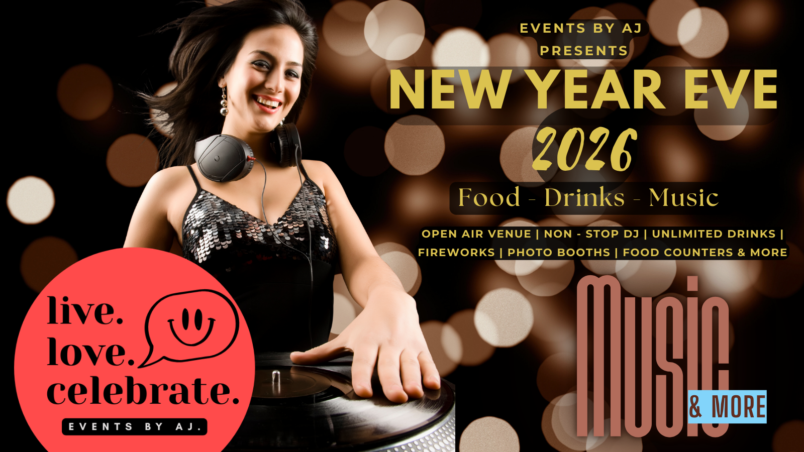 Events by AJ brings you Live.Love.Celebrate - NYE 2026 - Hyderabad's Buzziest Open-Air Festival, a grand year-end celebration under the sky with excellent vibes, music, fireworks, a photo booth for selfies & delicious finger-licking food.