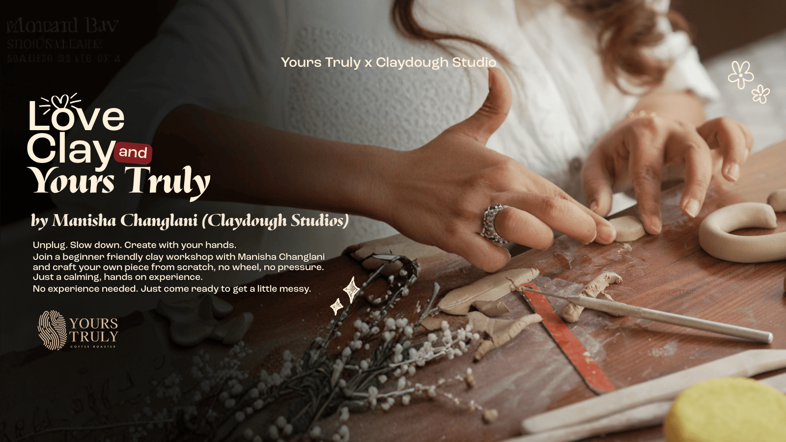 Join a calming, beginner-friendly clay workshop by Manisha Changlani from Claydough Studio. Where you’ll unplug and create a piece from scratch. In this guided hand-building session, you’ll shape and personalize your own clay creation using tools, textures, and stencils - no pottery wheel, no pressure. Just a therapeutic, hands-on experience and the simple joy of making.