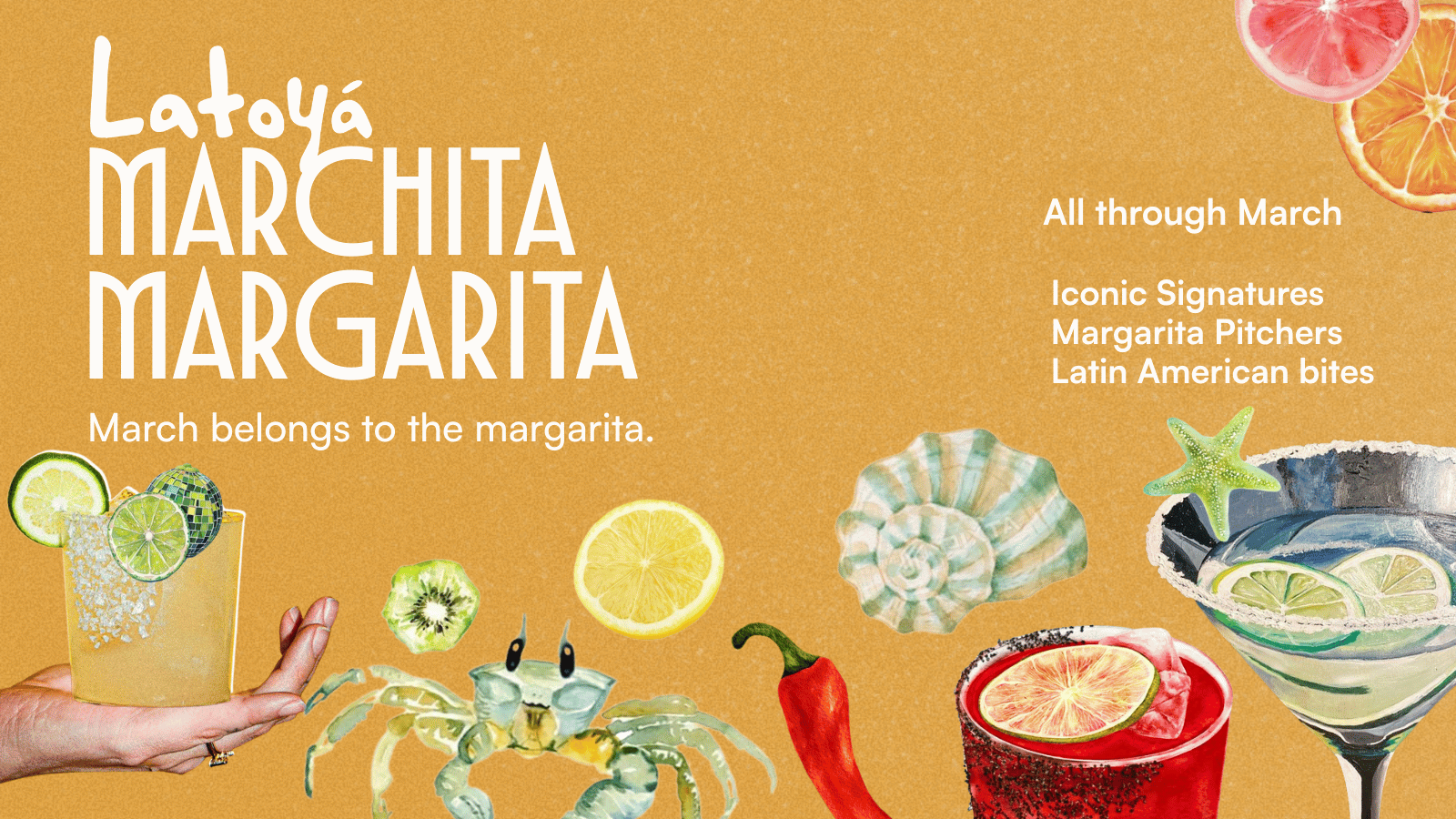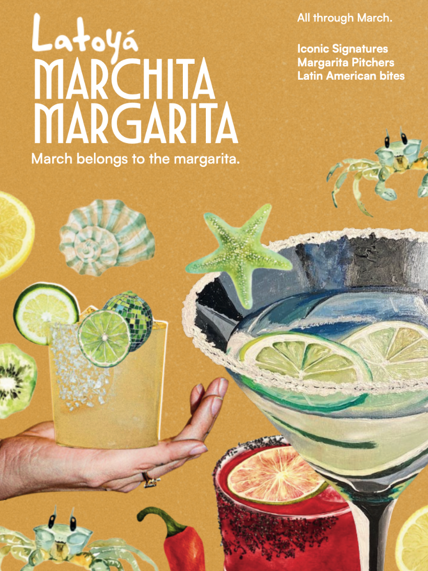 Marchita Margarita brings the first taste of summer to Latoyá. Through the month, we’re pouring our festival signature margaritas alongside margarita pitchers designed for the table—bright, bold pours meant for long afternoons that ease into the evening.