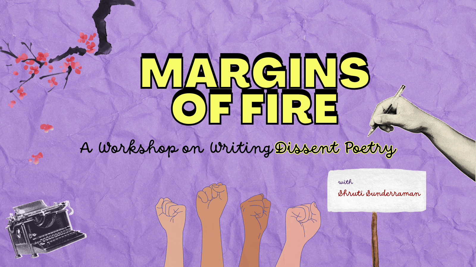 Margins of Fire is a writing workshop on poetry as dissent where we learn what it means to write from the edges, against silence, and in moments where language feels both insufficient and necessary.