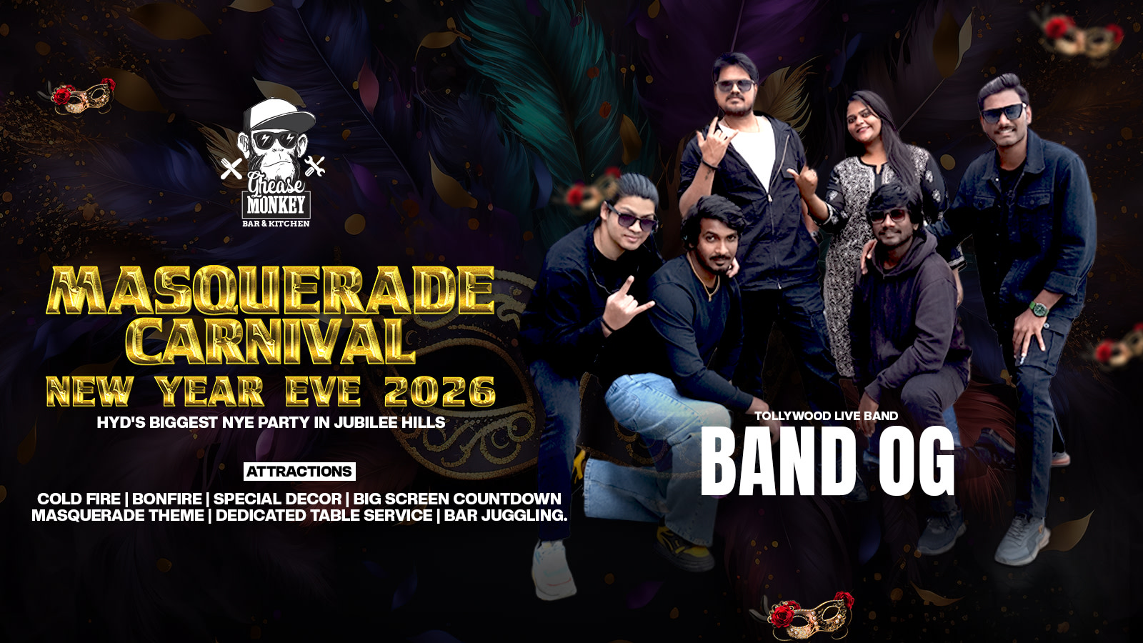 Masquerade Live brings you an electrifying evening of live Tollywood music led by the sensational Band OG. Expect high-energy performances, iconic sing-along hits, and a powerful stage presence that keeps the crowd engaged from start to finish. Wrapped in a grand masquerade carnival theme, the experience is elevated with stunning décor, immersive lighting, and a festive atmosphere designed for celebration. This is a night where live music, elegance, and party spirit come together for an unforgettable experience