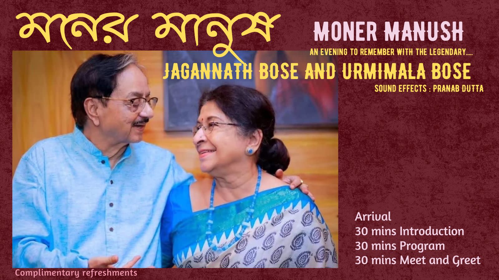Experience a soulful evening of stories and memories with the legendary Jagannath Bose and Urmimala Bose at Dough and Beyond Cafe. Moner Manush celebrates the timeless beauty of the couple's performance, brought alive through captivating narration and soundscapes, with music and background by Pranab Dutta.