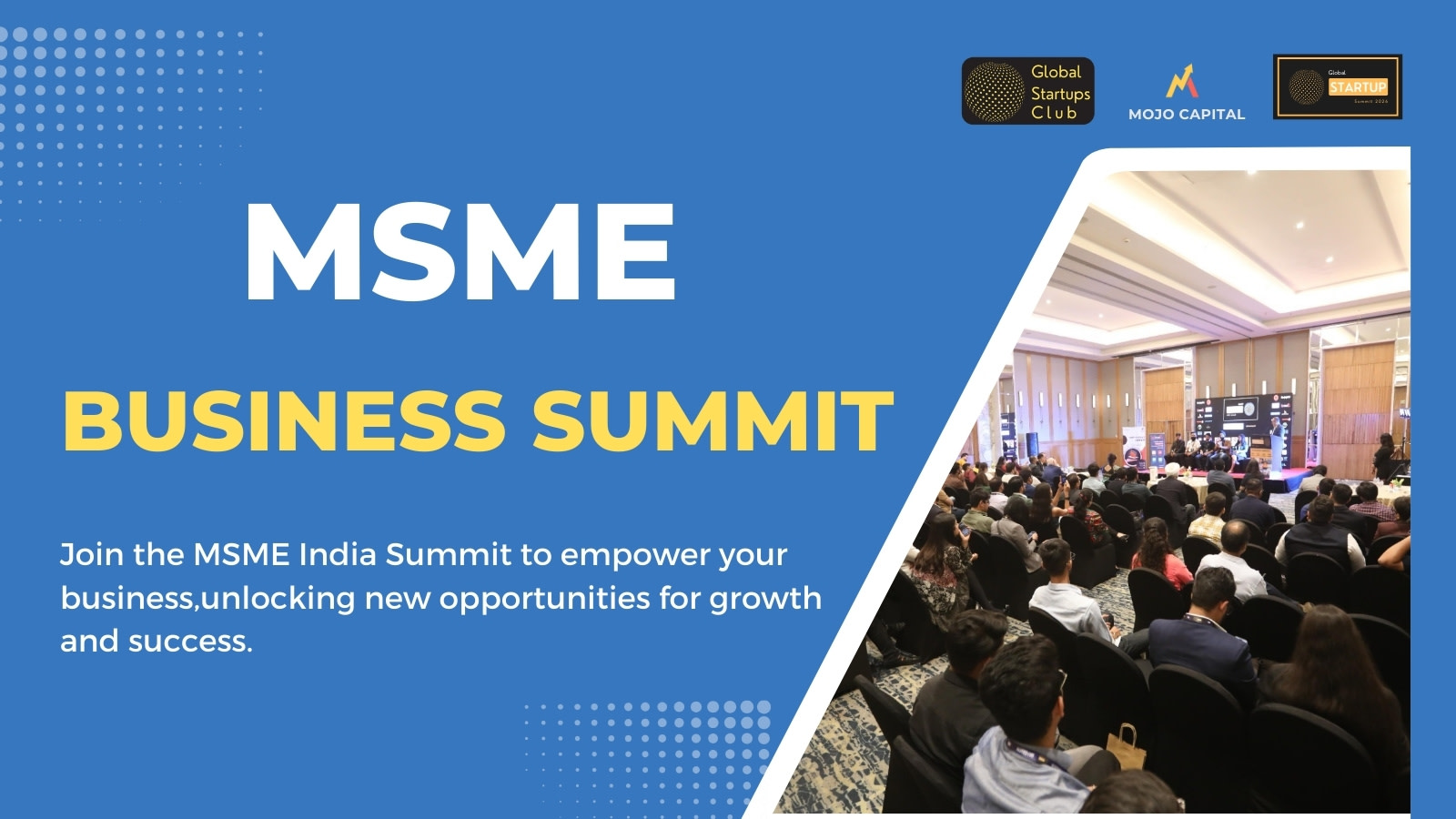 The MSME Business Summit is designed to support India’s MSME ecosystem enabling small and medium enterprises to collaborate innovate and thrive. This is a co-organised event with Global Startup Summit