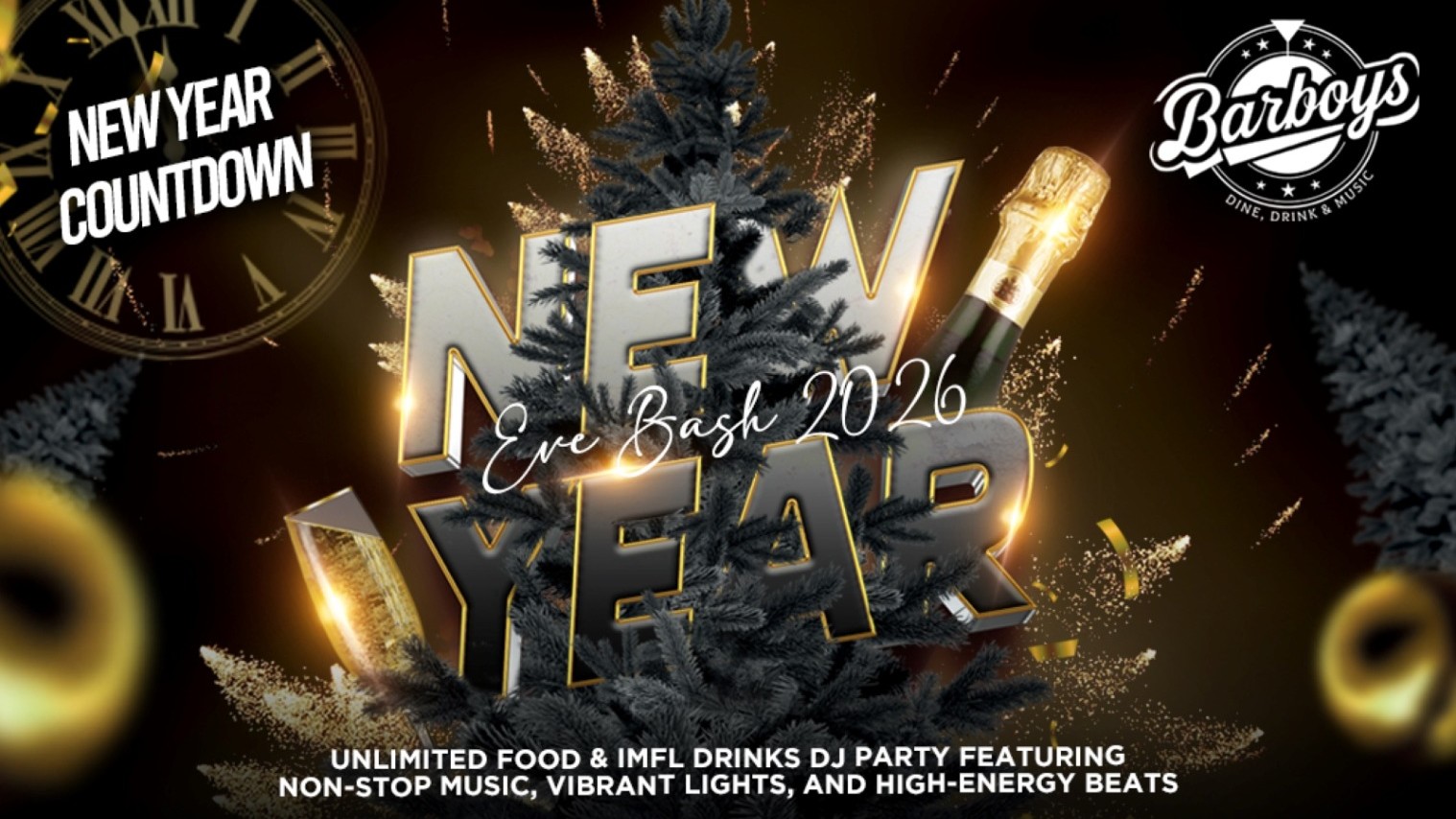 Set a festive tone for welcoming the new year with joy, reflection, and celebration, featuring elements like sparkling decor, champagne toasts, dancing, good food, fireworks, and resolutions, blending excitement for the future with gratitude for the past year's memories.