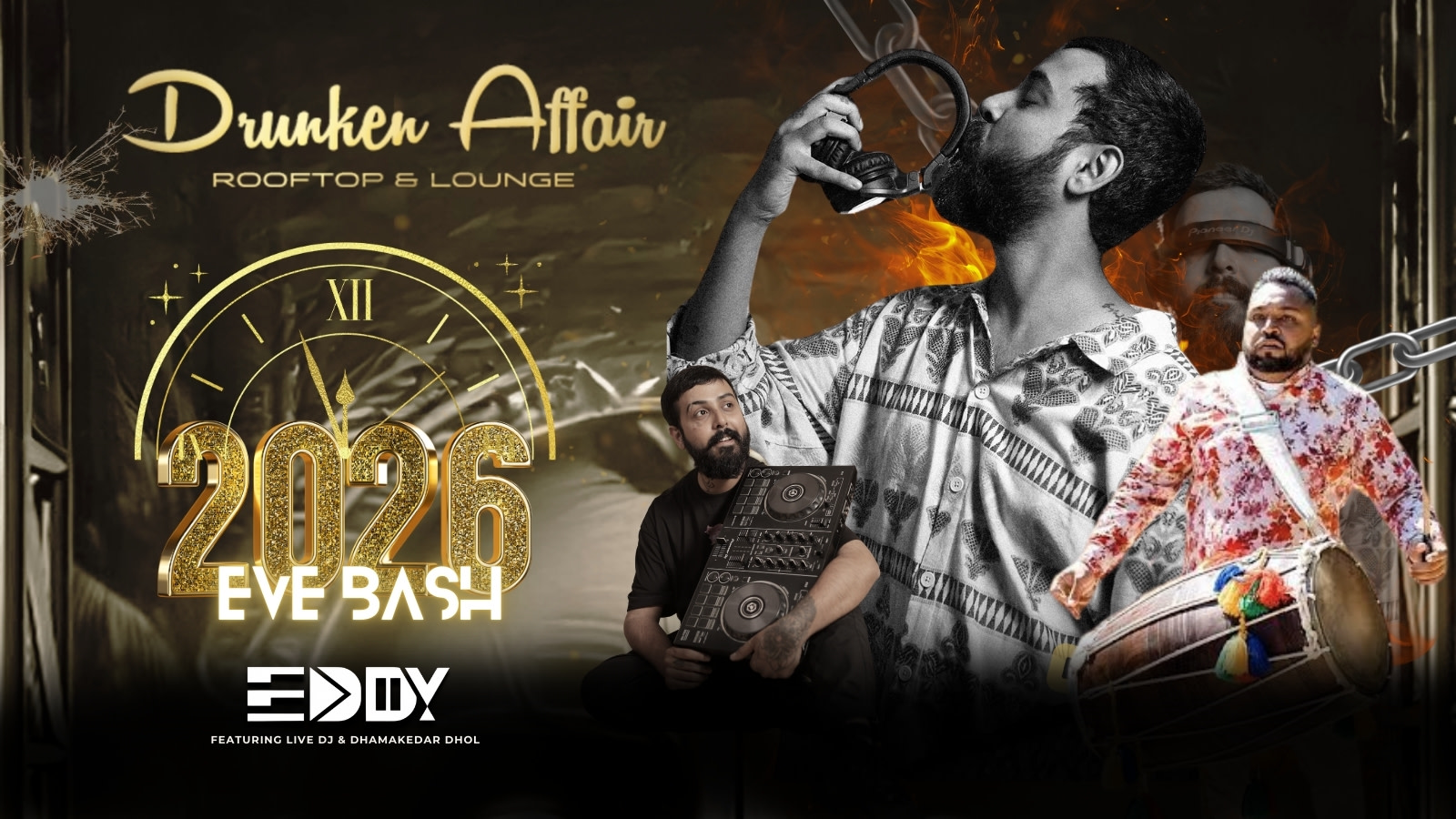 Get ready to welcome 2026 in true Punjabi style at Drunken Affair – Rooftop & Lounge with an explosive NYE 2026 Punjabi Dhol Night that promises nonstop energy, music, and celebration. 🔥✨ This New Year’s Eve, witness an electrifying performance by DJ Eddy, spinning high-octane beats that blend perfectly with dhamakedar live Punjabi dhol, creating an atmosphere that’s loud, vibrant, and impossible to resist.