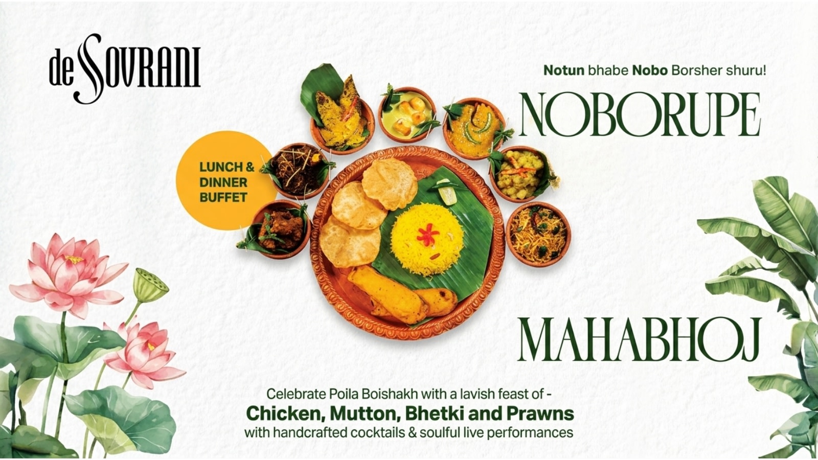 Celebrate Poila Boishakh with a grand Noborupe Mahabhoj, featuring an indulgent lunch and dinner buffet. Enjoy a festive spread of Chicken, Mutton, Bhetki, and Prawns, paired with handcrafted cocktails and soulful live performances. Step into the new year with rich flavors, vibrant traditions, and a feast that feels like home—only grander.