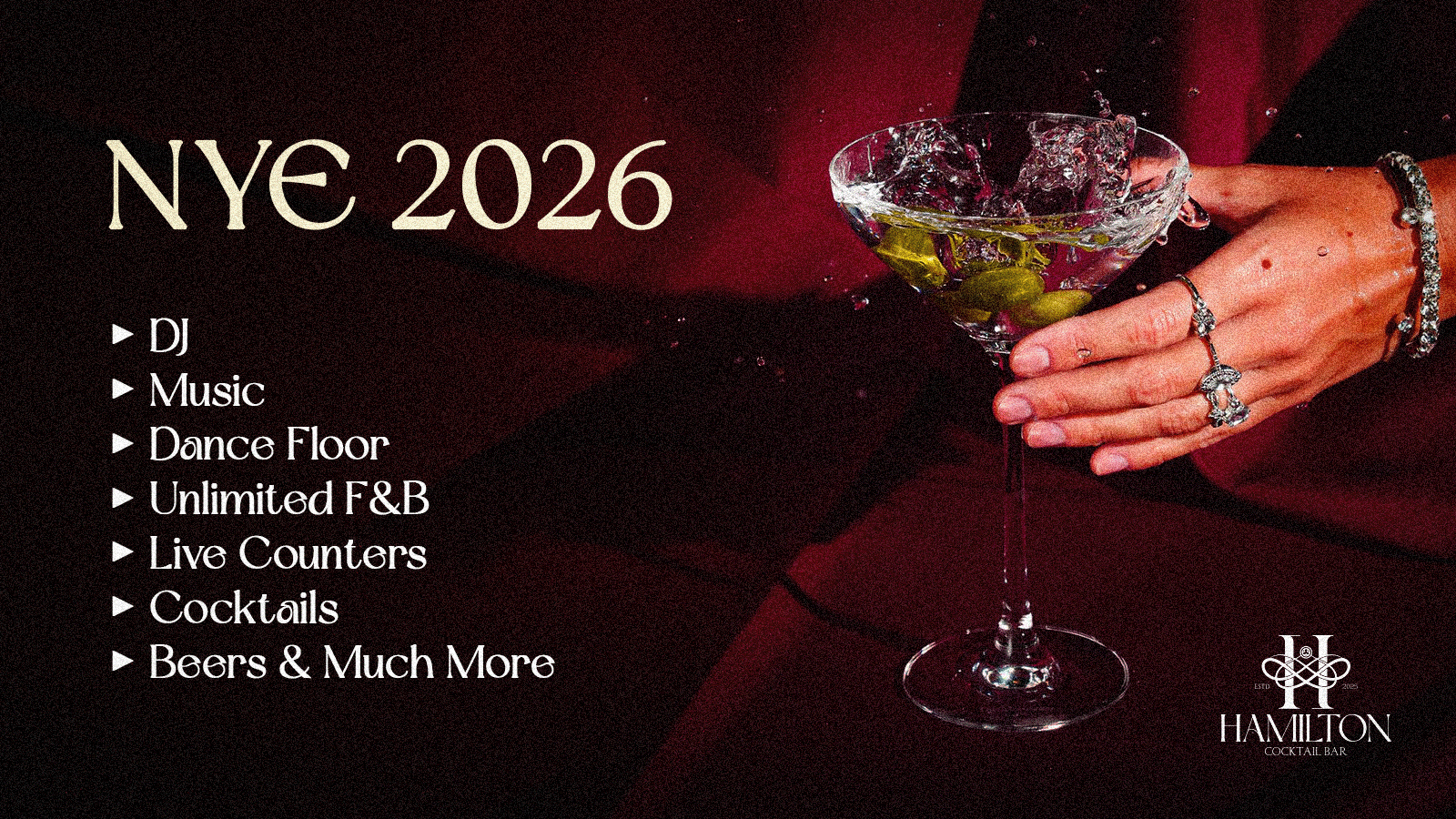Welcome to NYE 2026 at Hamilton, a meticulously curated night of unlimited pours, elevated DJ sets and indulgent live food counters.