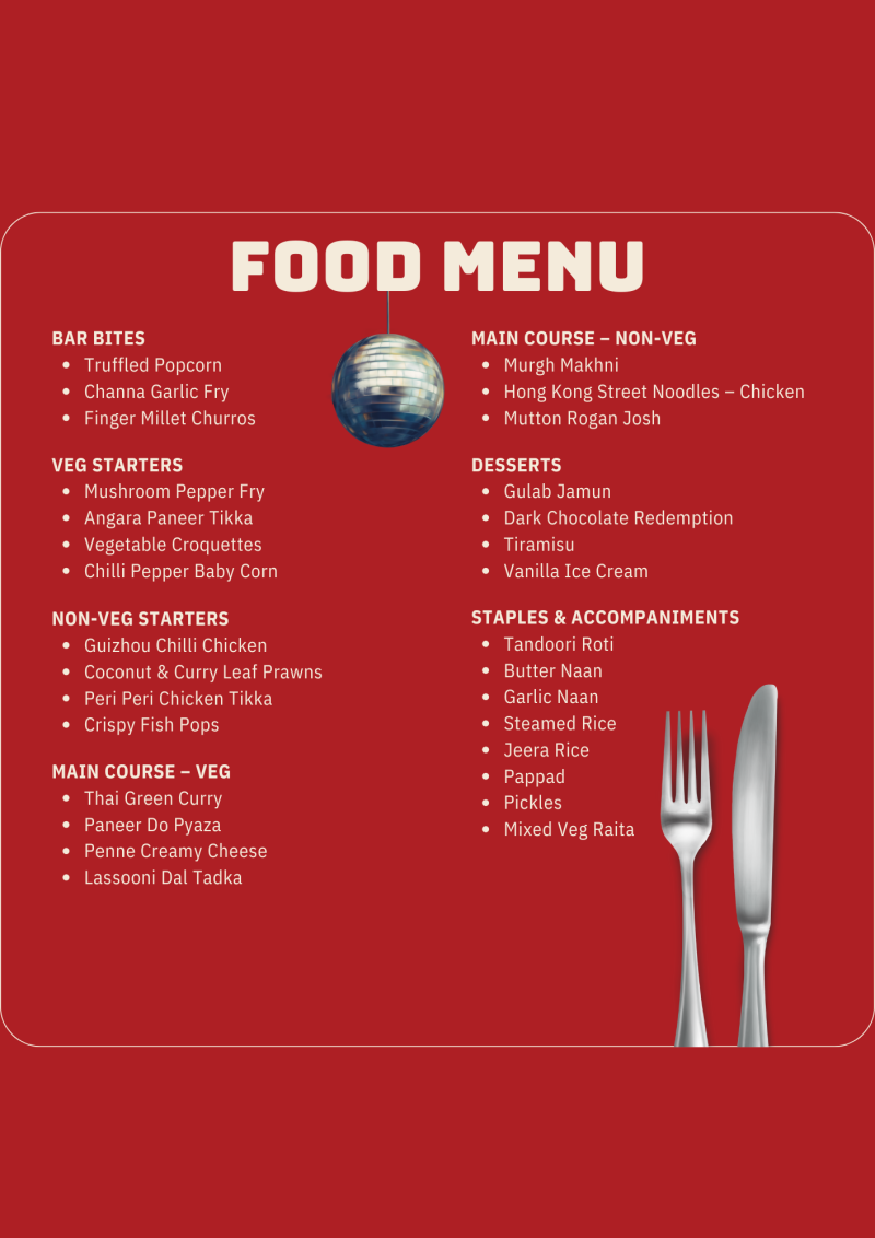 (think bar bites, vegetarian & non-vegetarian starters, hearty mains, fresh breads, rice, and indulgent desserts)