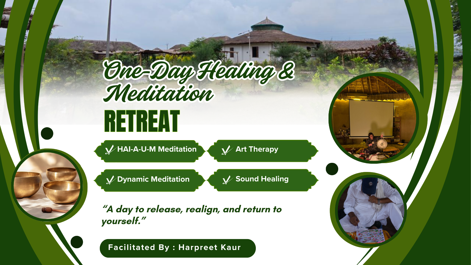Step into a transformative One-Day Healing & Meditation Retreat at The Cottage Core Village. Experience HAI-A-U-M Meditation, Dynamic Meditation, Art Therapy, and Sound Healing in a serene natural setting. A soulful day to release stress, realign your energy, and reconnect with your true self. Guided by Harpreet Kaur.
