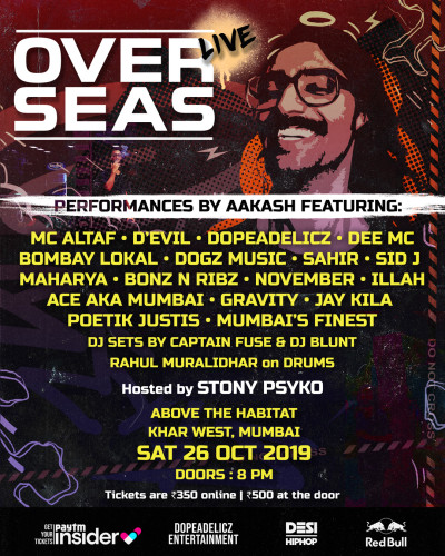 For the first time ever, AAKASH is performing his debut album "Over Seas" in its entirety featuring the biggest names in Indian Hip-Hop like MC ALTAF, D'EVIL, DOPEADELICZ, DEE MC and more. The show features DJ sets with a live band and performances from 16 rappers and MCs.
