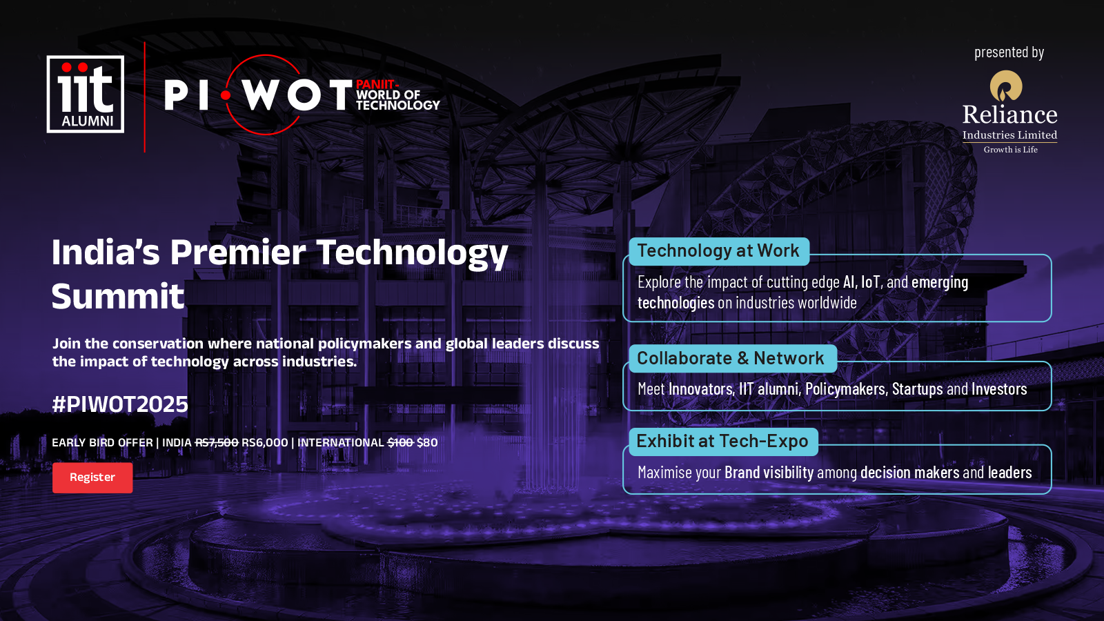 PIWOT, its flagship event, brings together IIT alumni from around the world to drive innovation, collaboration, and societal impact. It serves as a platform to showcase groundbreaking ideas, foster connections, and tackle global challenges through the collective expertise of the IIT community. PIWOT 2025 marks the third edition of this event, with the theme 'Technology at Work.'