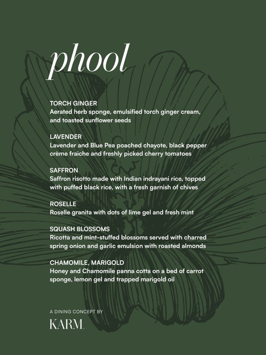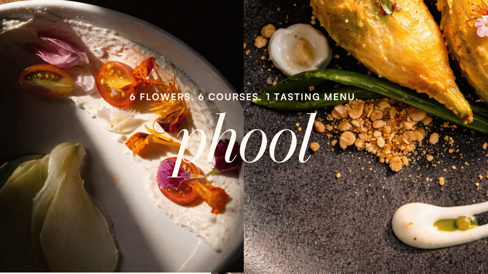 Phool is an all-vegetarian 6-course set menu experience where we play with floral flavors