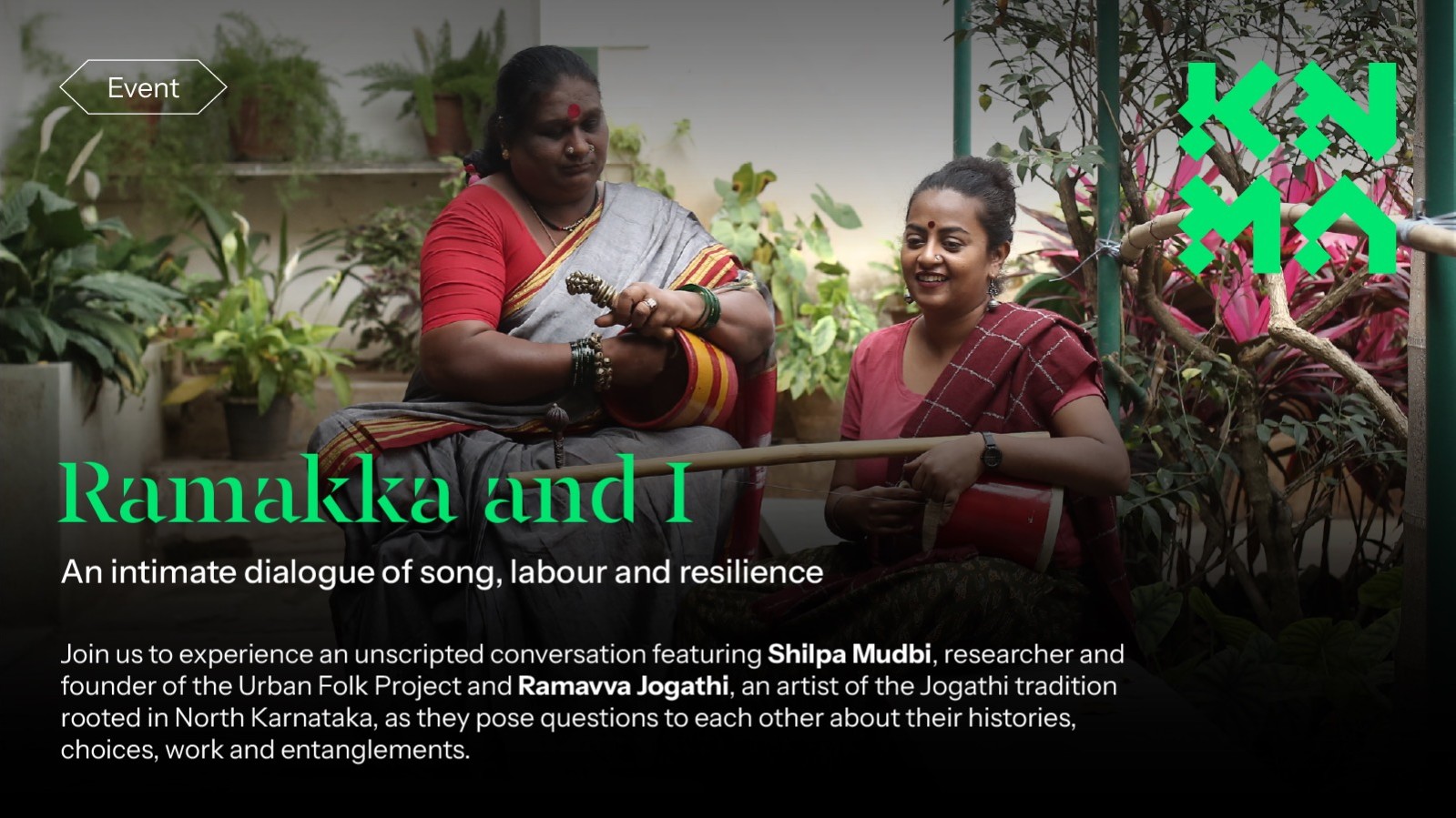 Ramakka and I features two women: Shilpa Mudbi, researcher and founder of the Urban Folk Project, and Ramavva Jogathi, a traditional artist of the Jogathi tradition rooted in North Karnataka. In this unscripted, intimate conversation woven with Jogathi songs, they pose questions to each other — about their histories, their choices, their work, and their entanglements. Ramakka and I becomes a moving archive of lived memory, survival, artistic labour, and everyday resilience. It is not a polished duet, but a live negotiation of politics, pain, and the radical act of staying in conversation