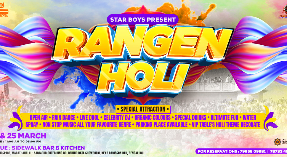 RANGEN HOLI :: Presnting you BIGGEST HOLI FESTIVAL ON TOWN : Get ready to celebrate Holi with vibrant colors and festive spirit on march 24th & 25th side walk marathahalli join us in celebarting the essence of this joy full festival and take in the natural colour that will leave you feelling renewed and refreshed .... Specieal attraction (Open Air | Rain Dance | Celebraity Djs | Live Dhol | Organic Color | Water Spray | Special Drinks | Bar Counter | Ultimate Fun | Non-stop Music All yor favorite Genre | Parking place available | VIP tables | Holi Themed Decoret