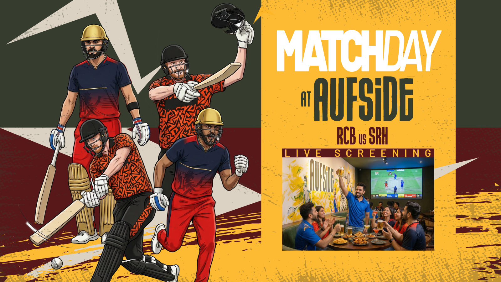 Catch one of the most electrifying clashes of the season as Royal Challengers Bangalore take on Sunrisers Hyderabad - streamed live on massive screens at Aufside. Experience every boundary, every wicket, and every roar in a stadium-like atmosphere with fellow cricket fans.