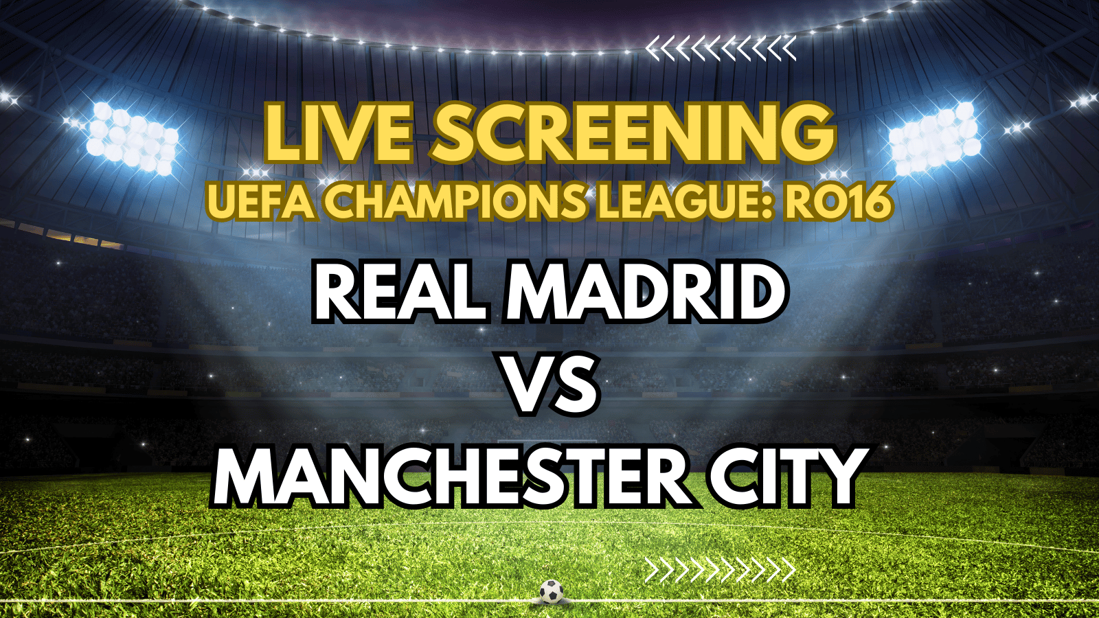 Join us for a thrilling UEFA Champions League showdown between Real Madrid and Manchester City, screened live with fellow fans in an electric atmosphere.