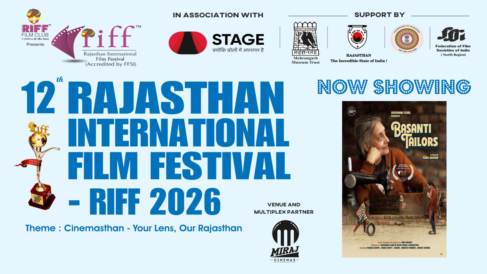 After eleven successful editions (eight editions in Jaipur and three editions in Jodhpur), the next 12th edition of RIFF - Rajasthan International Film Festival - RIFF 2026 will be held at Miraj Cinemas, Blue City Mall, Circuit House Road, Jodhpur, Rajasthan.