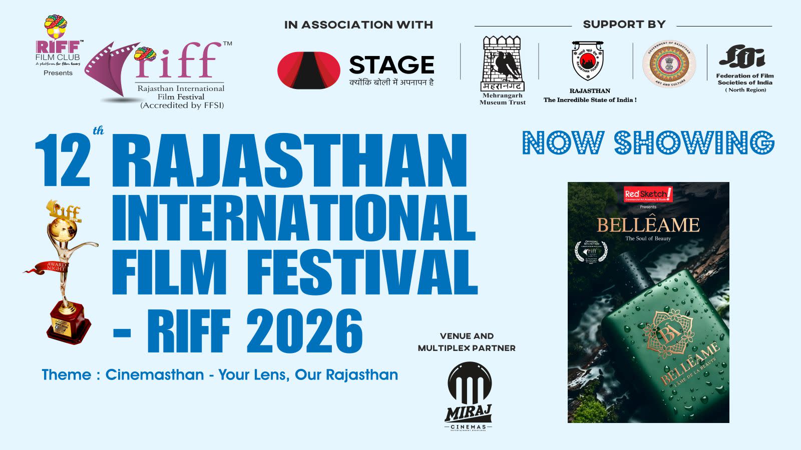 After eleven successful editions (eight editions in Jaipur and three editions in Jodhpur), the next 12th edition of RIFF - Rajasthan International Film Festival - RIFF 2026 will be held at Miraj Cinemas, Blue City Mall, Circuit House Road, Jodhpur, Rajasthan.