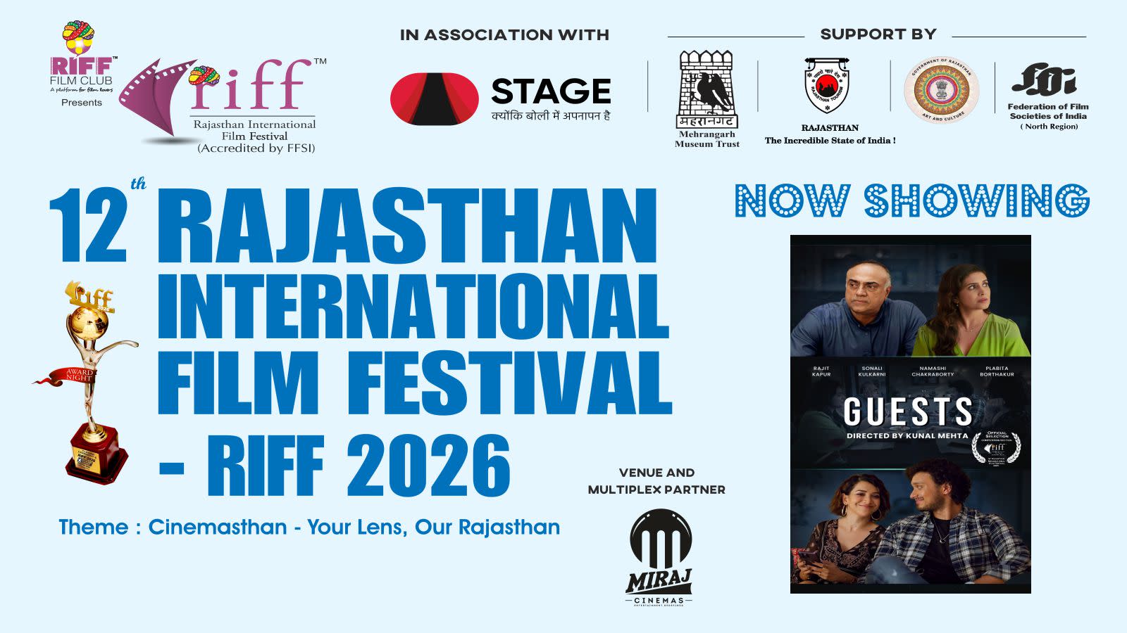 After eleven successful editions (eight editions in Jaipur and three editions in Jodhpur), the next 12th edition of RIFF - Rajasthan International Film Festival - RIFF 2026 will be held at Miraj Cinemas, Blue City Mall, Circuit House Road, Jodhpur, Rajasthan.