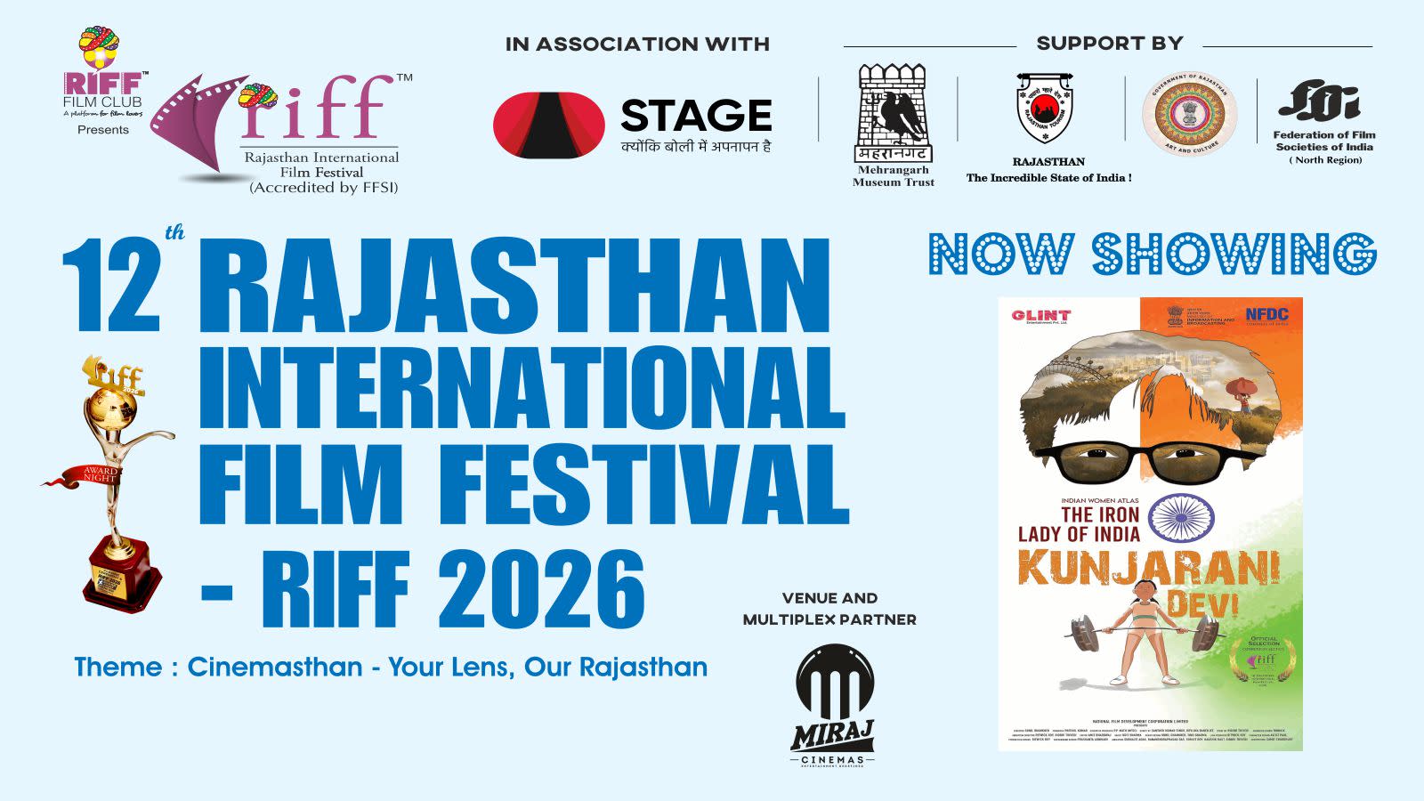After eleven successful editions (eight editions in Jaipur and three editions in Jodhpur), the next 12th edition of RIFF - Rajasthan International Film Festival - RIFF 2026 will be held at Miraj Cinemas, Blue City Mall, Circuit House Road, Jodhpur, Rajasthan.