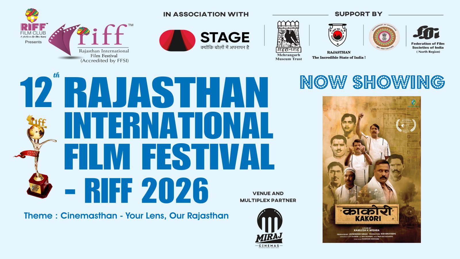 After Successful Eleven editions (Eight editions in Jaipur and Three editions in Jodhpur) the next 12th edition of RIFF - Rajasthan International Film Festival - RIFF 2026 will be held at Miraj Cinemas, Blue City Mall , Circuit House Road, Jodhpur, Rajasthan.