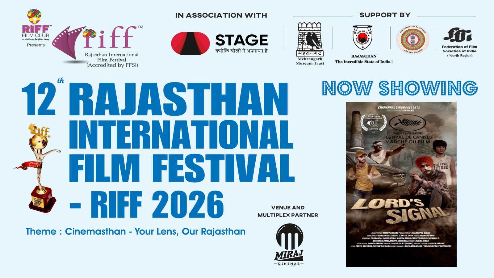 After eleven successful editions (eight editions in Jaipur and three editions in Jodhpur), the next 12th edition of RIFF - Rajasthan International Film Festival - RIFF 2026 will be held at Miraj Cinemas, Blue City Mall, Circuit House Road, Jodhpur, Rajasthan.