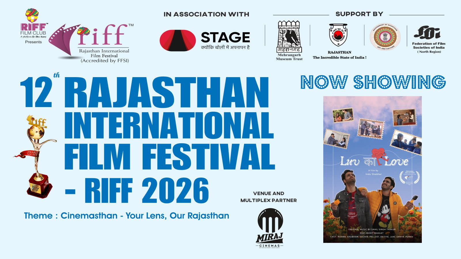 After eleven successful editions (eight editions in Jaipur and three editions in Jodhpur), the next 12th edition of RIFF - Rajasthan International Film Festival - RIFF 2026 will be held at Miraj Cinemas, Blue City Mall, Circuit House Road, Jodhpur, Rajasthan.