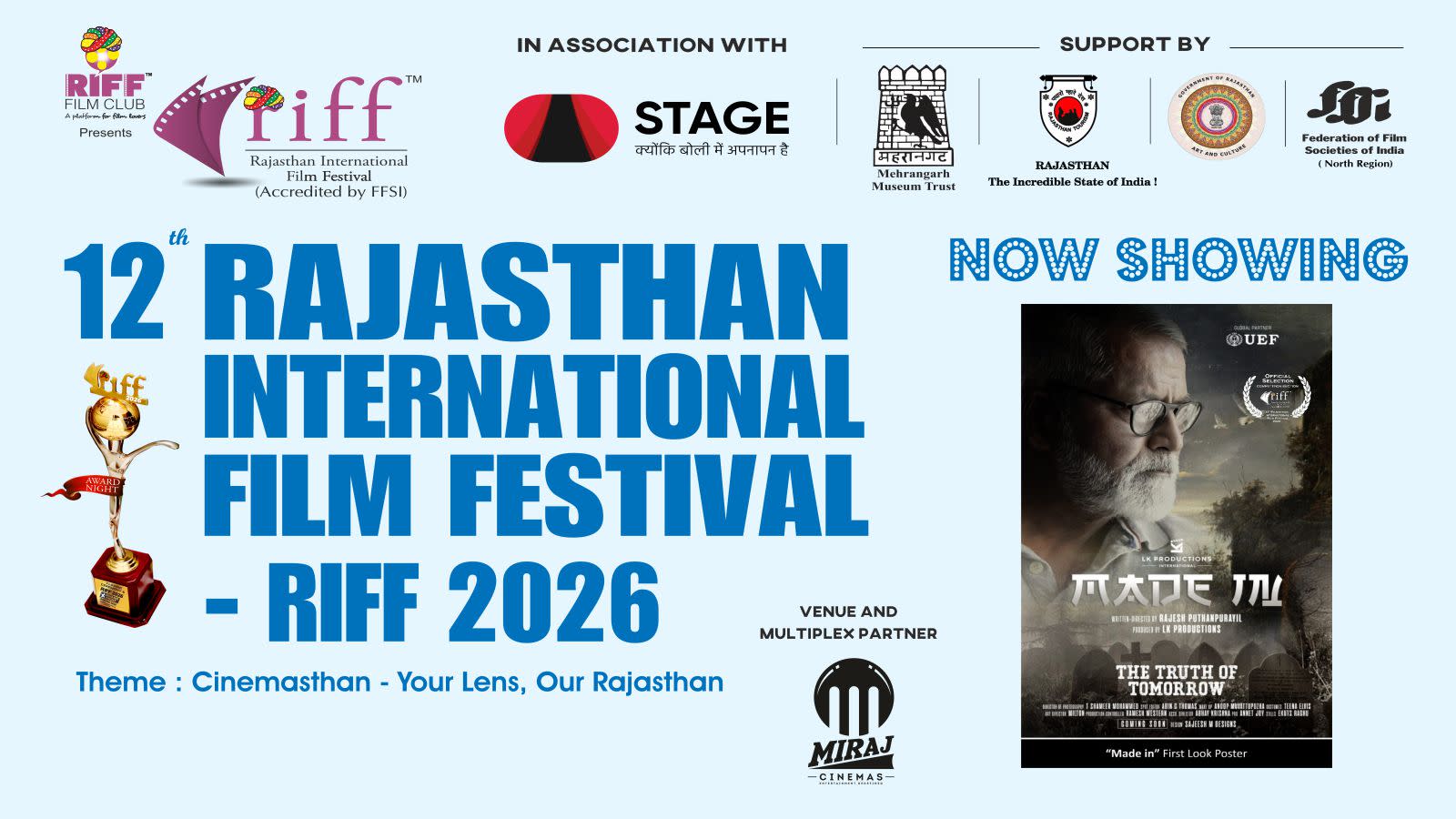 After eleven successful editions (eight editions in Jaipur and three editions in Jodhpur), the next 12th edition of RIFF - Rajasthan International Film Festival - RIFF 2026 will be held at Miraj Cinemas, Blue City Mall, Circuit House Road, Jodhpur, Rajasthan.