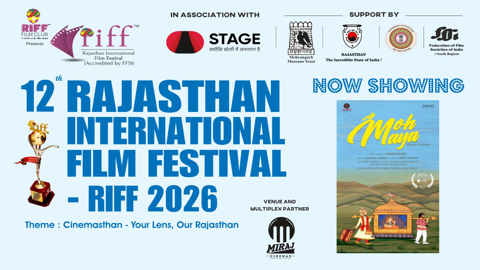 After eleven successful editions (eight editions in Jaipur and three editions in Jodhpur), the next 12th edition of RIFF - Rajasthan International Film Festival - RIFF 2026 will be held at Miraj Cinemas, Blue City Mall, Circuit House Road, Jodhpur, Rajasthan.