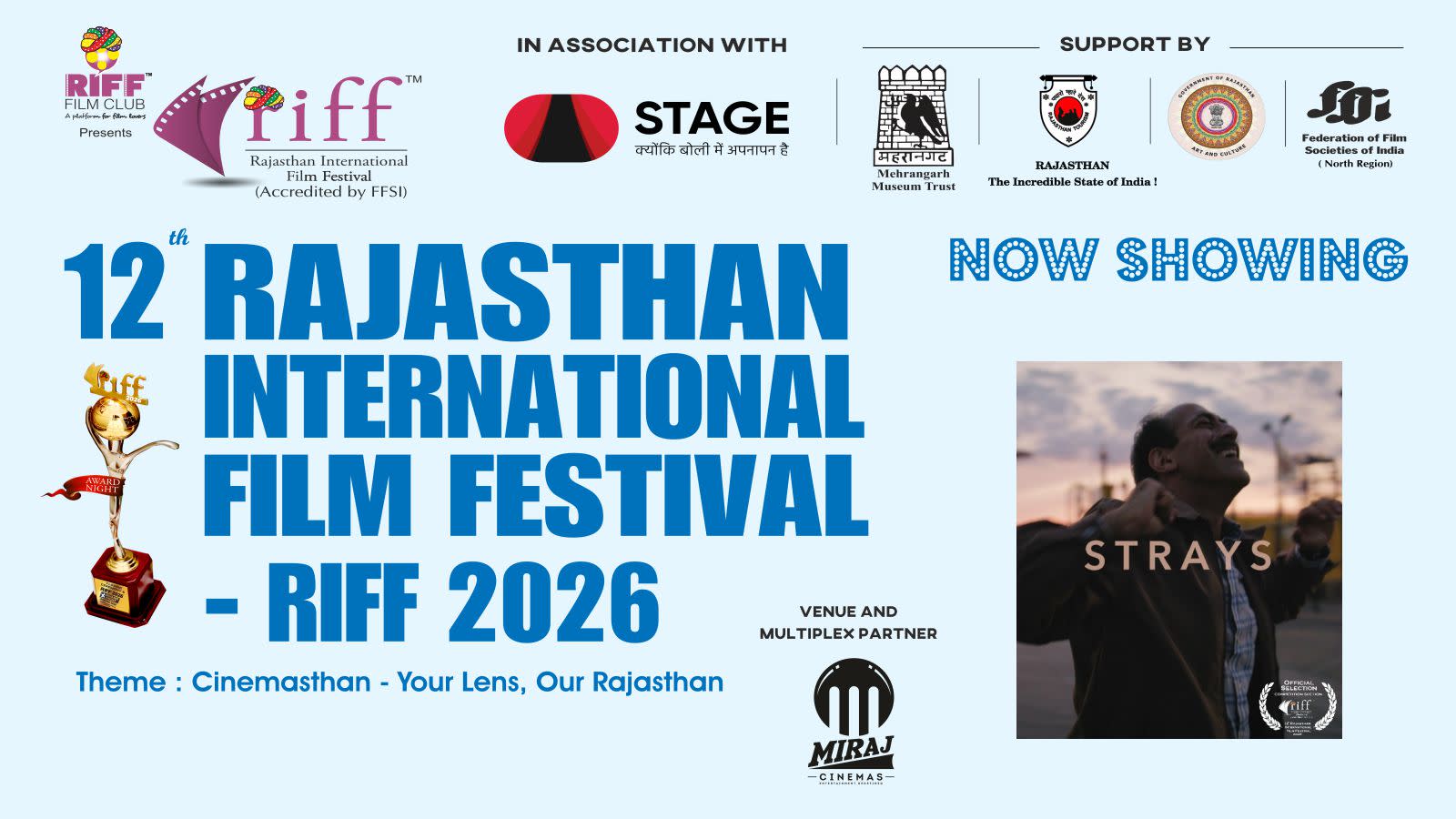 After eleven successful editions (eight editions in Jaipur and three editions in Jodhpur), the next 12th edition of RIFF - Rajasthan International Film Festival - RIFF 2026 will be held at Miraj Cinemas, Blue City Mall, Circuit House Road, Jodhpur, Rajasthan.