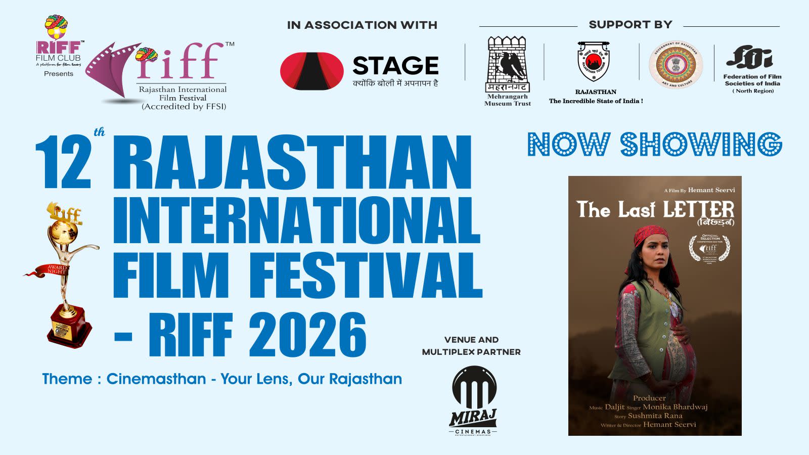 After eleven successful editions (eight editions in Jaipur and three editions in Jodhpur), the next 12th edition of RIFF - Rajasthan International Film Festival - RIFF 2026 will be held at Miraj Cinemas, Blue City Mall, Circuit House Road, Jodhpur, Rajasthan.