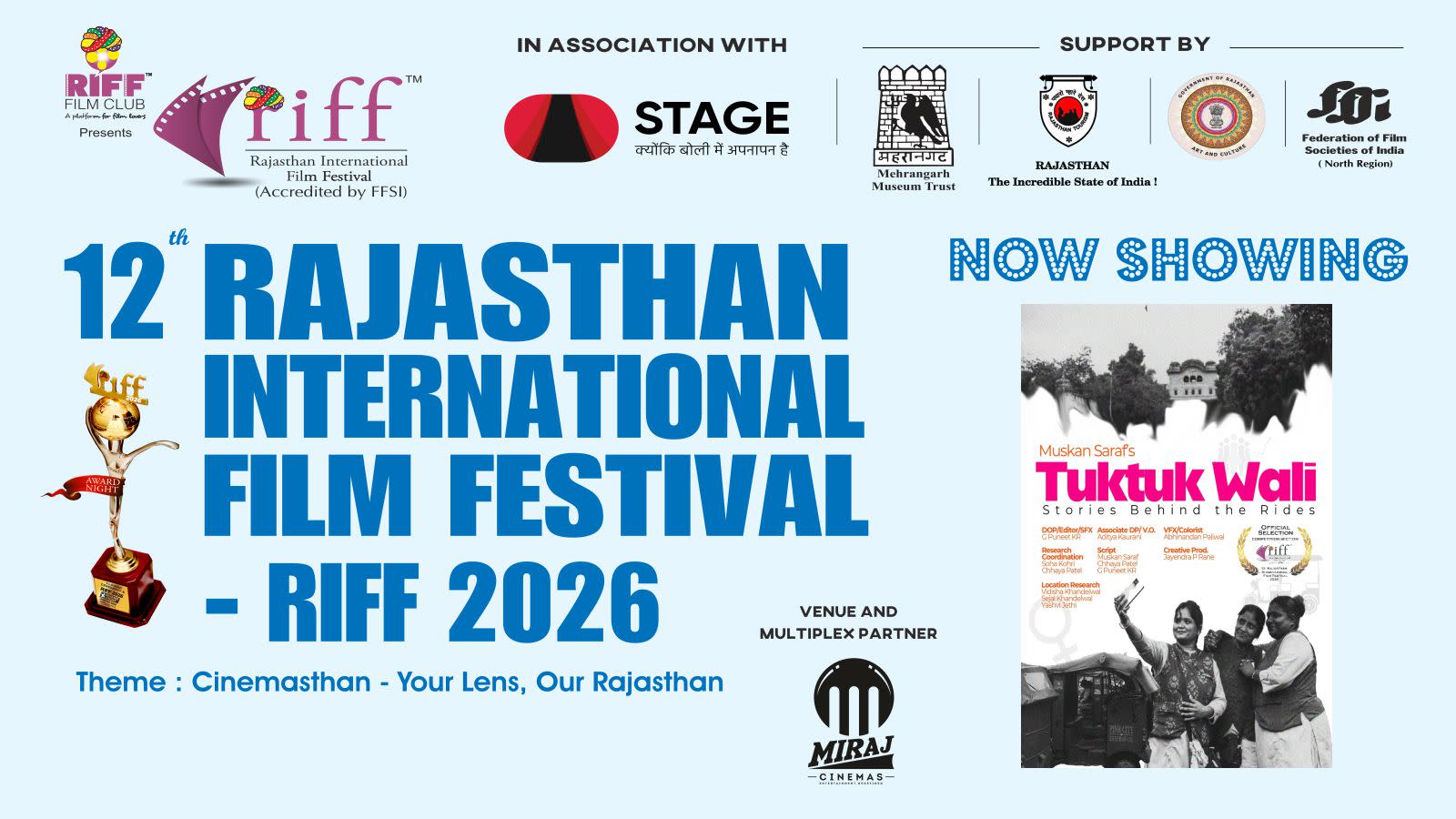 After eleven successful editions (eight editions in Jaipur and three editions in Jodhpur), the next 12th edition of RIFF - Rajasthan International Film Festival - RIFF 2026 will be held at Miraj Cinemas, Blue City Mall, Circuit House Road, Jodhpur, Rajasthan.