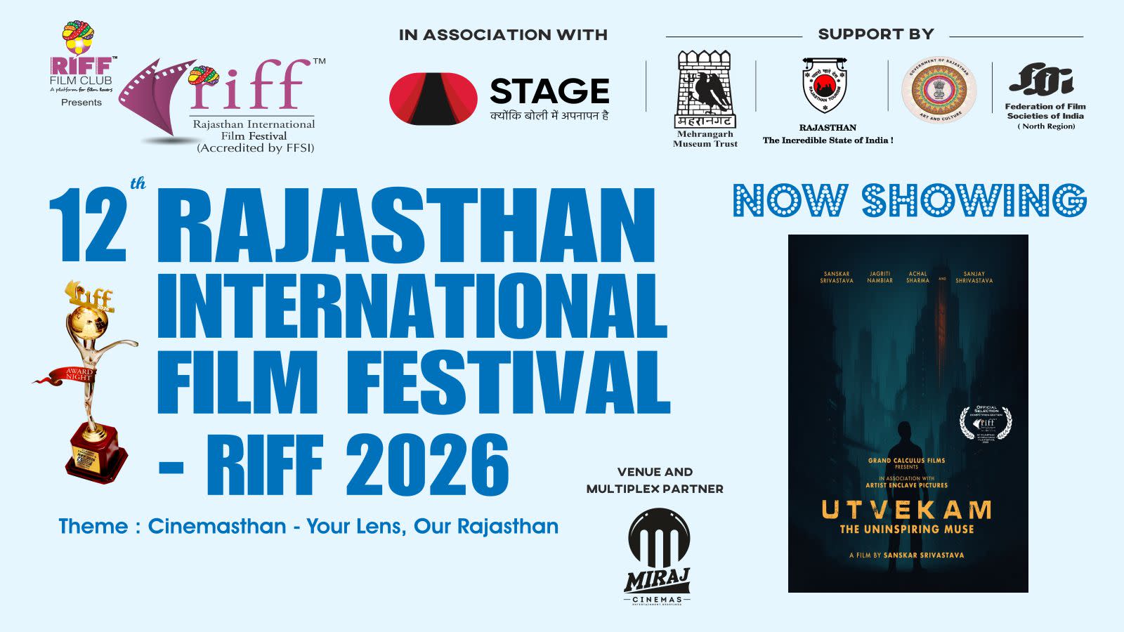 After eleven successful editions (eight editions in Jaipur and three editions in Jodhpur), the next 12th edition of RIFF - Rajasthan International Film Festival - RIFF 2026 will be held at Miraj Cinemas, Blue City Mall, Circuit House Road, Jodhpur, Rajasthan.