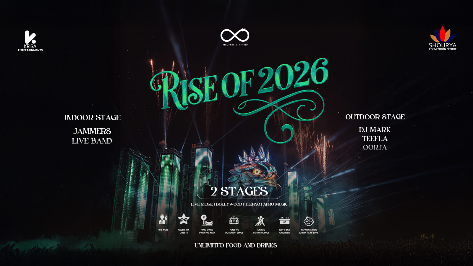 Step into 2026 with the city's most electric New Year’s Eve experience! Rise of 2026 brings you a massive festival-style celebration featuring two spectacular stages. Whether you love the soul of a live band or the thumping bass of a DJ, we have it all. With celebrity guests, fire acts, and a massive culinary spread, this is the only place to be when the clock strikes twelve.