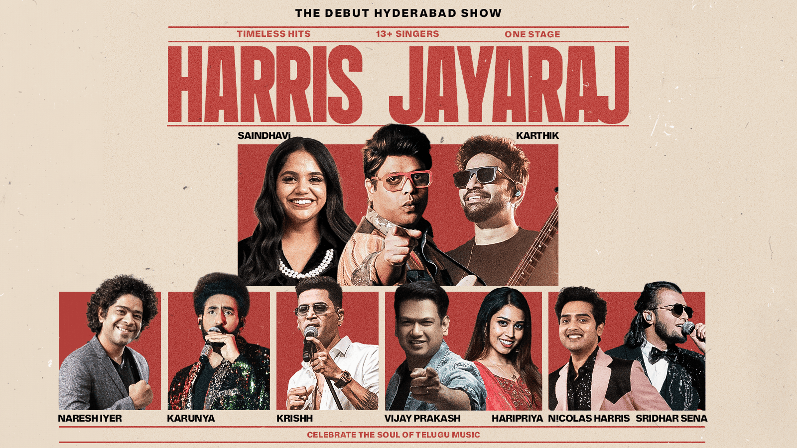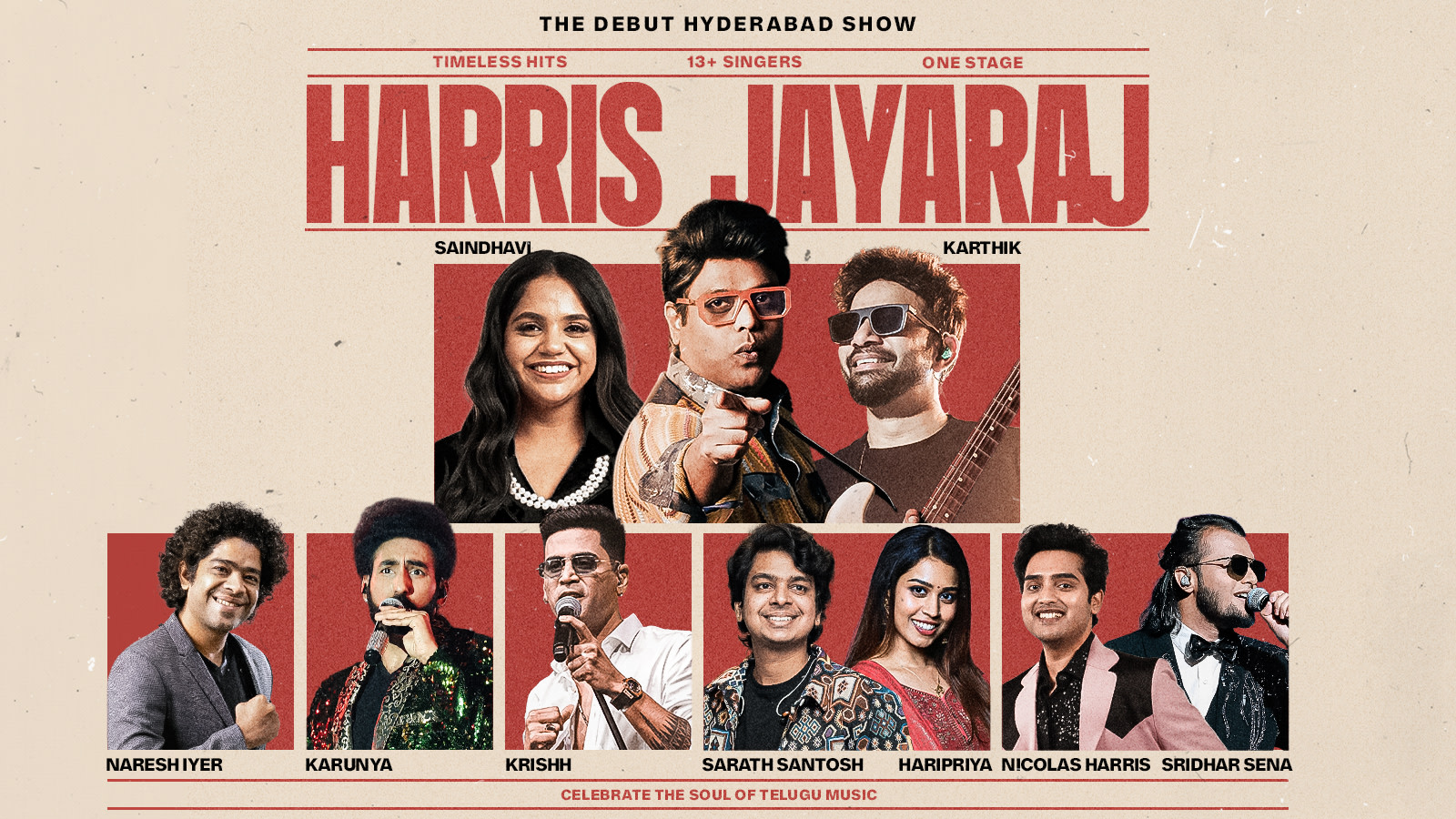 For the first time, the legendary Harris Jayaraj brings his debut Telugu musical show to the city — a celebration of the timeless soul of Telugu music joined by an extraordinary team of 18 powerhouse singers for a night of magic, nostalgia, and pure emotion.