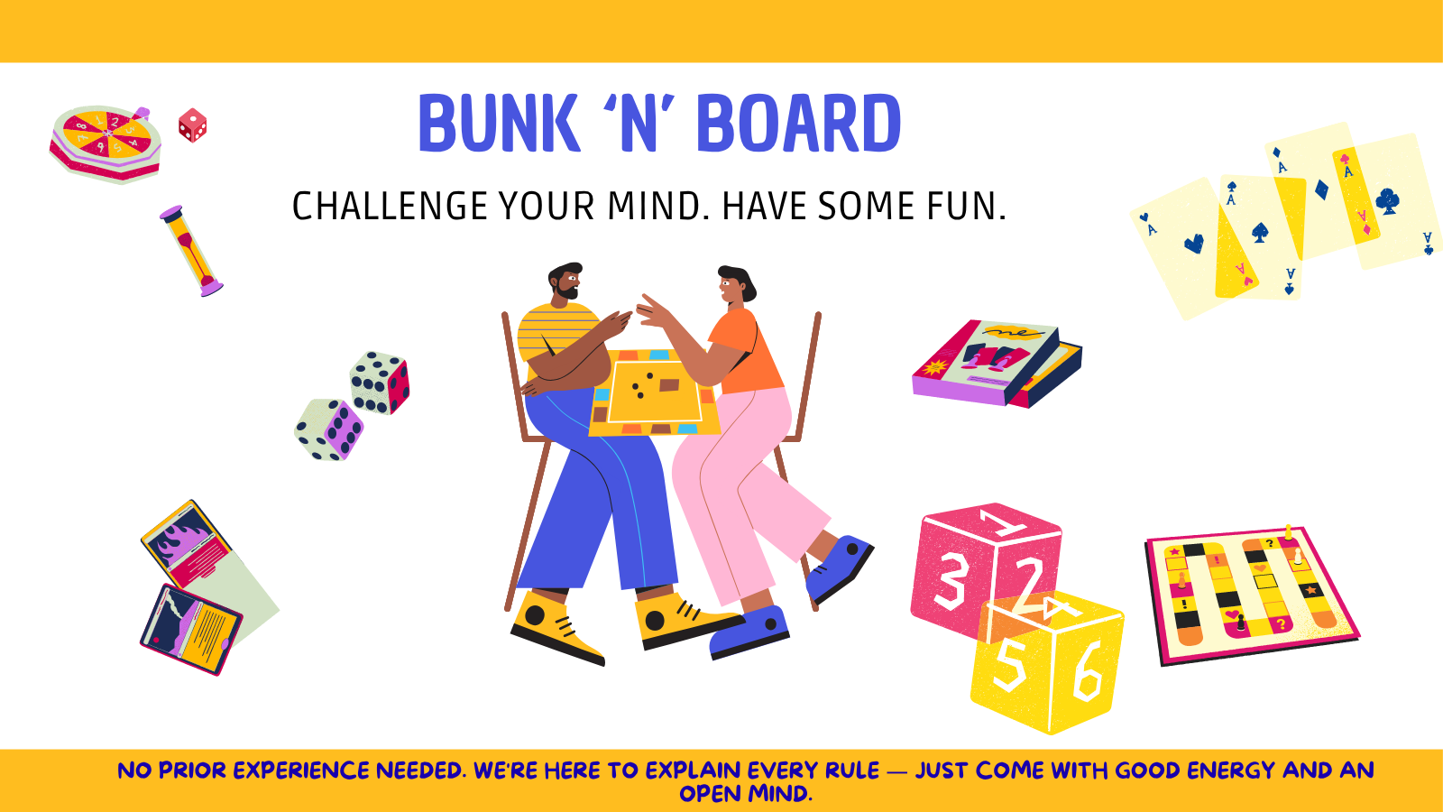 👋 No prior experience needed. Never played a board game before? Perfect. We've got you covered — our team will walk you through every rule, every mechanic, every move. All you need to bring is good energy and an open mind. The rest? We'll handle it.