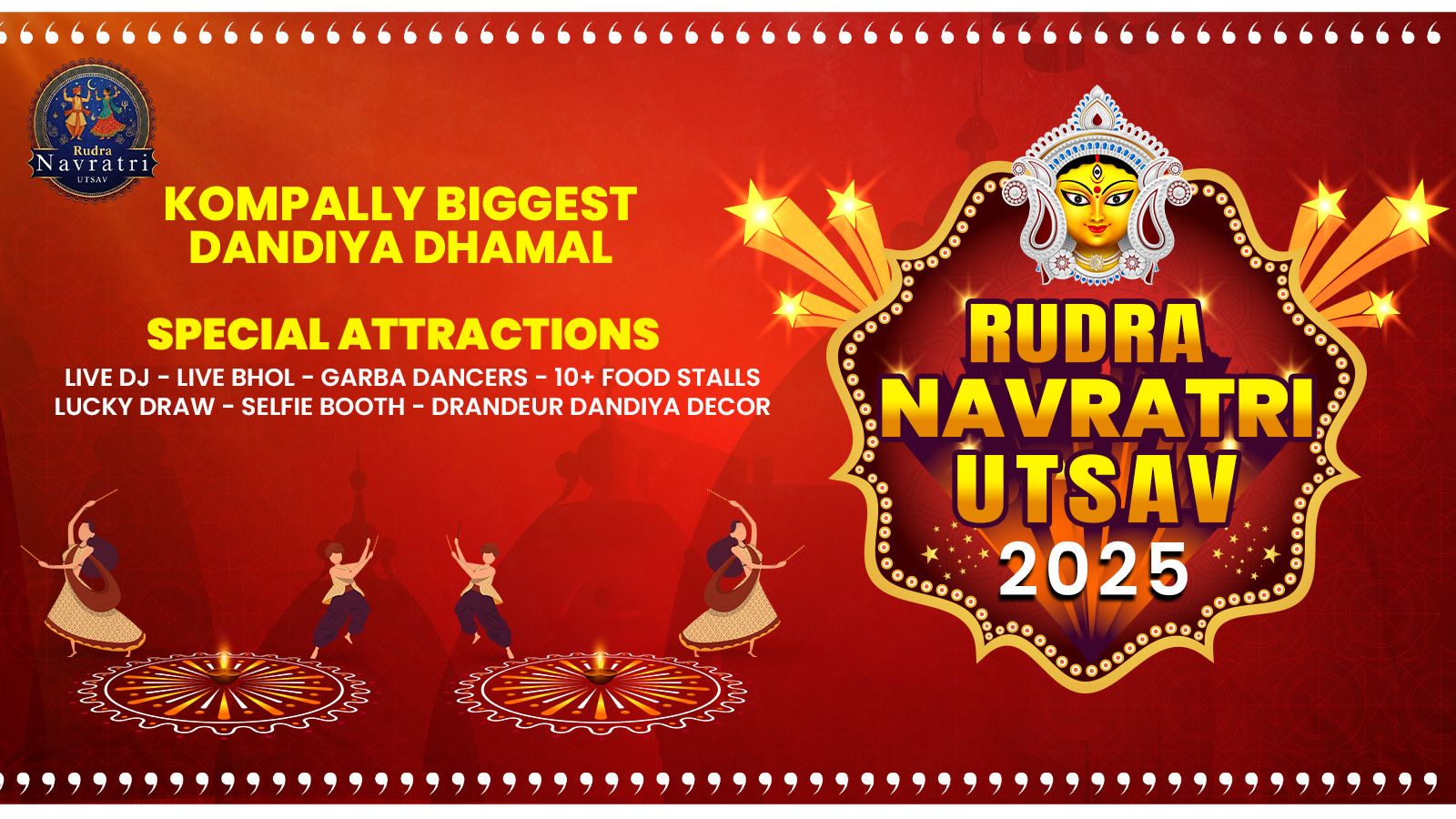✨ This Navratri, Kompally is all set to witness the grandest celebration of dance, music, and culture with Rudra Navratri Utsav! Get ready for non-stop energy, dazzling beats, and unforgettable festive vibes.