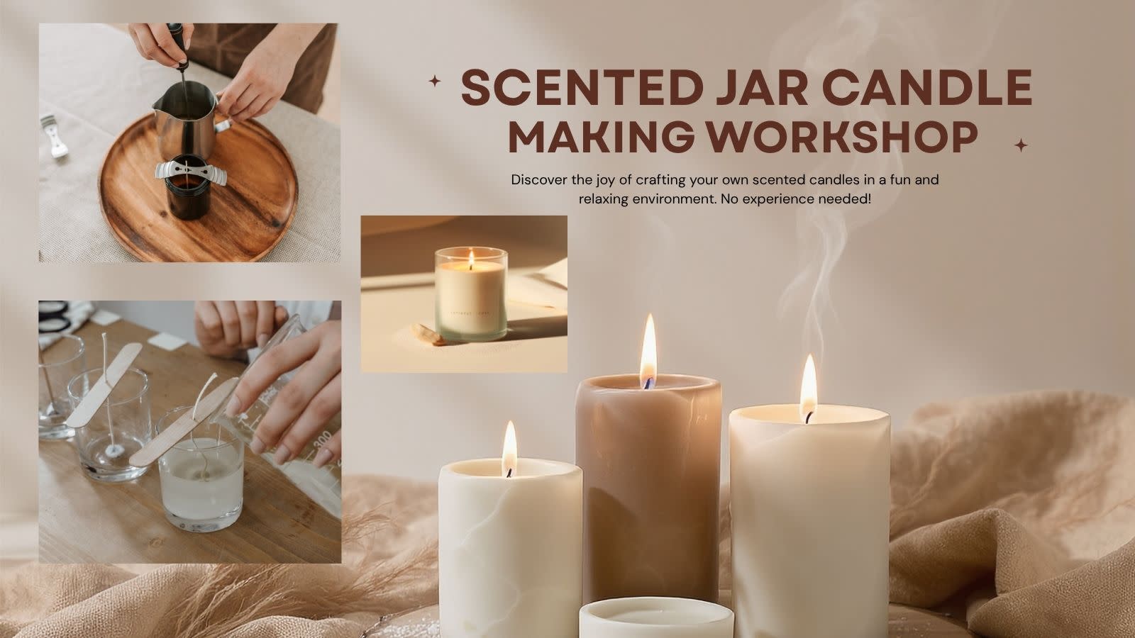Participants will learn about different types of wax, fragrance oils, wicks, and containers, along with essential techniques for melting, blending, and pouring candles safely. You’ll also explore how to layer scents, add colors, and design visually appealing candles that reflect your personal style.