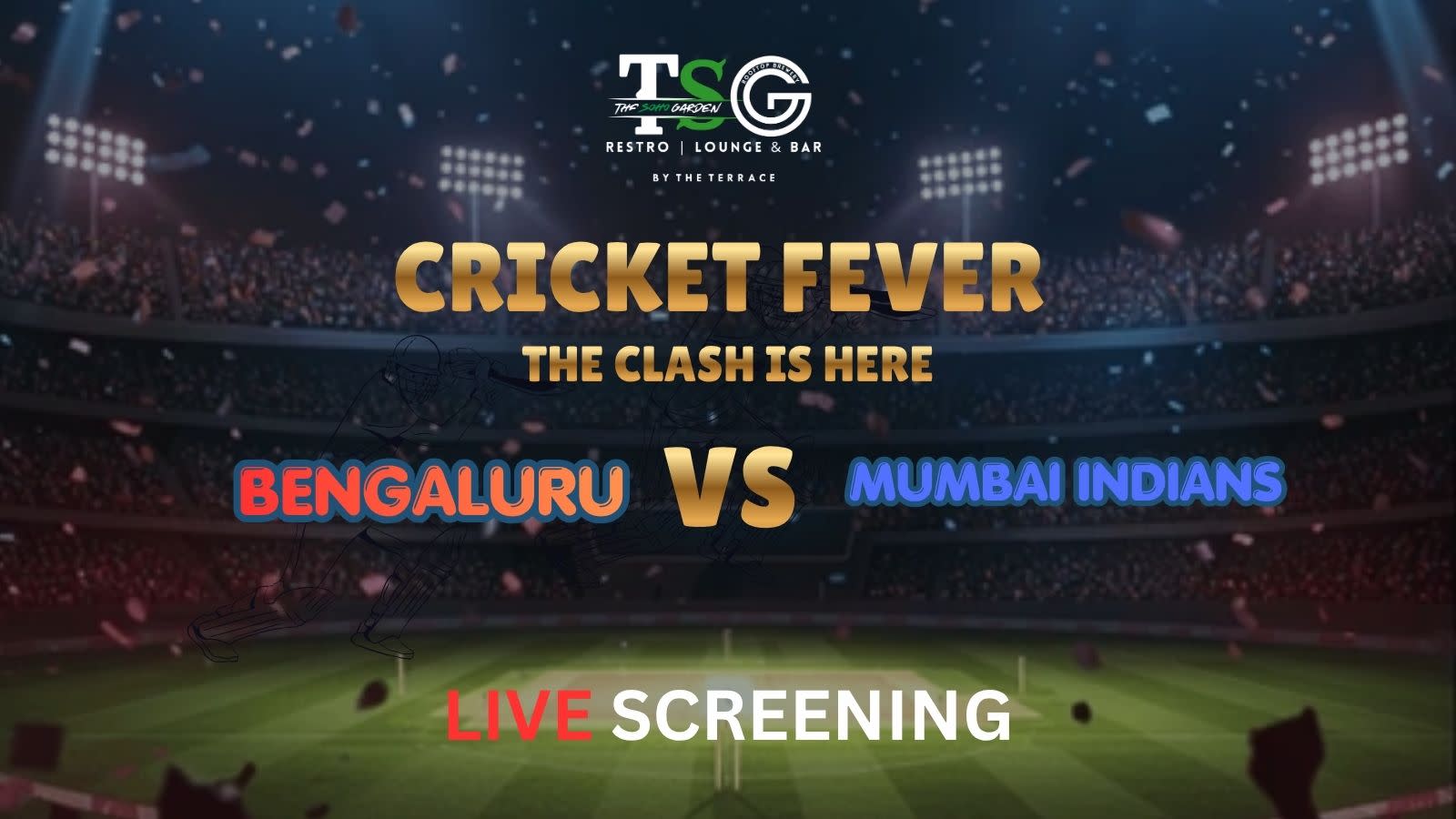 Get ready for a blockbuster IPL clash as Bengaluru take on Mumbai Indians in a high-voltage showdown! Join us at The Soho Garden for the Bengaluru vs Mumbai Indians Live Screening and witness every thrilling moment in a vibrant cricket atmosphere.