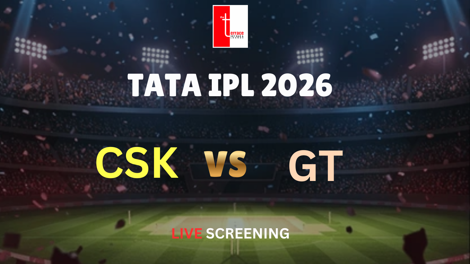 Get ready for a blockbuster IPL showdown as Chennai Super Kings take on Gujarat Titans in a high-voltage clash, live at The Terrace Skybar & Lounge!