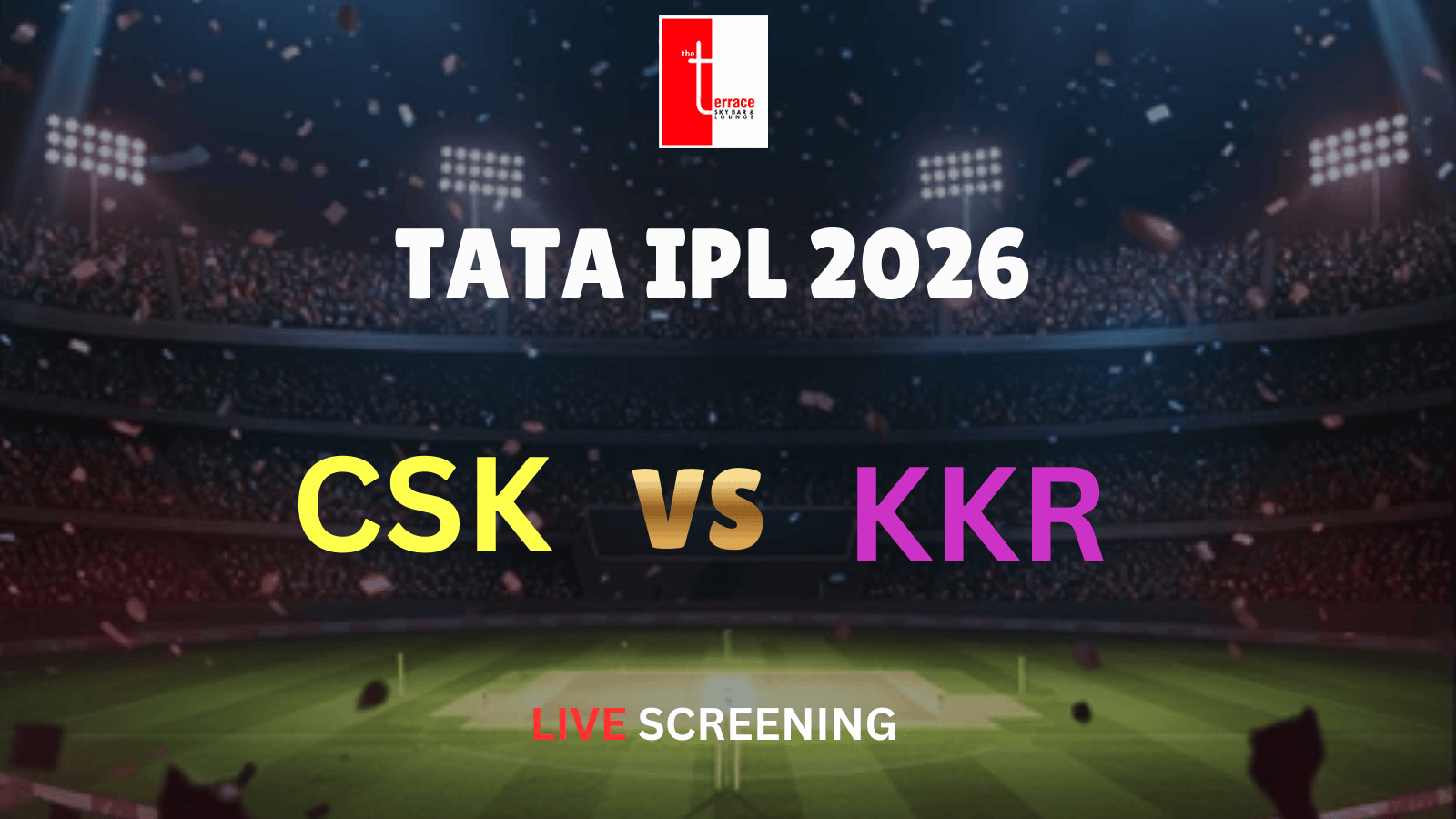 Get ready for a power-packed IPL clash as Chennai Super Kings take on Kolkata Knight Riders in an epic battle, live at The Terrace Skybar & Lounge!