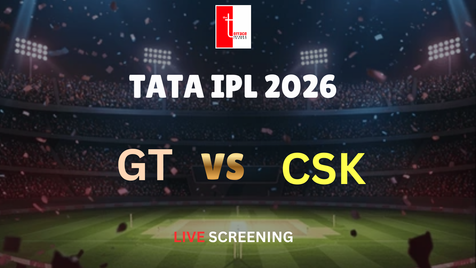 Get ready for a blockbuster IPL showdown as Gujarat Titans take on Chennai Super Kings in a high-voltage clash, live at The Terrace Skybar & Lounge!
