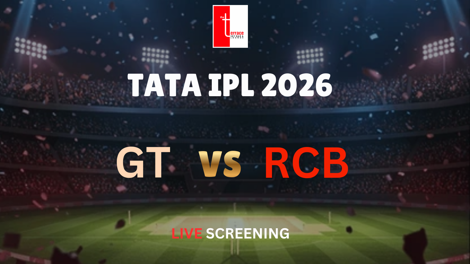 Get ready for a high-voltage IPL clash as Gujarat Titans take on Royal Challengers Bangalore in an electrifying showdown, live at The Terrace Skybar & Lounge!