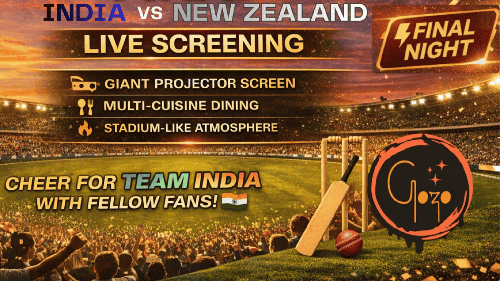 The biggest night of the tournament is here! Watch the ICC T20 World Cup Final as the Team India take on the New Zealand team LIVE. Experience the thrill of the final on a giant projector screen + two large LED TVs with a stadium-like atmosphere, great food, and passionate cricket fans all around. One match. One trophy. One champion. This is the grand finale of the ICC Men's T20 World Cup, where two of the world’s strongest teams battle for the title. India enter the final after a thrilling semi-final win, while New Zealand booked their spot with a dominant performance.