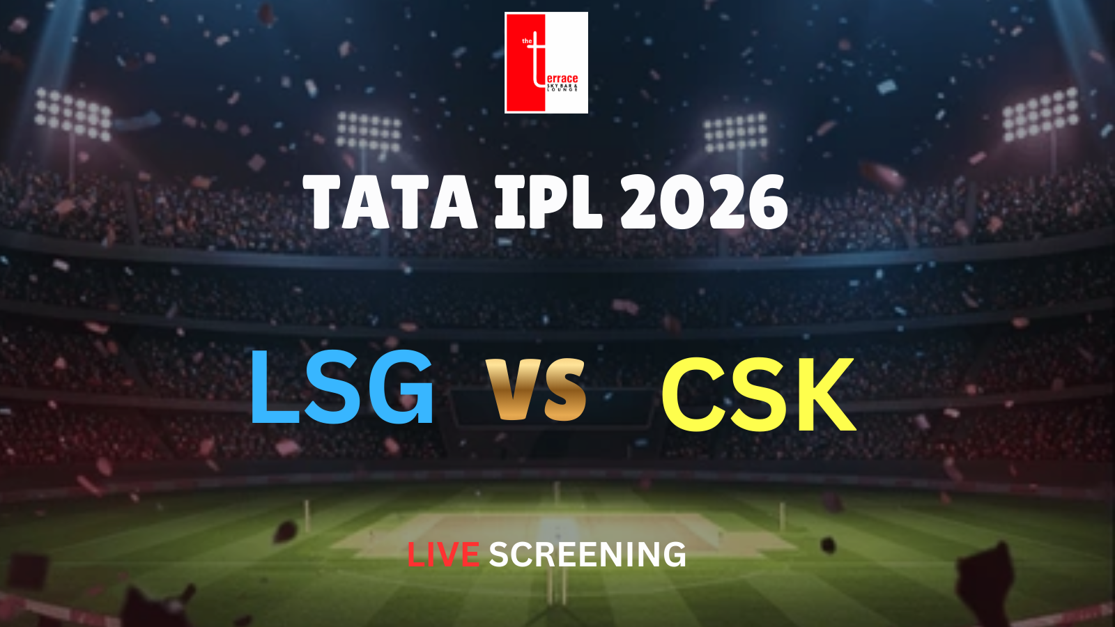 Get ready for a high-voltage IPL clash as Lucknow Super Giants take on Chennai Super Kings in an electrifying showdown, live at The Terrace Skybar & Lounge!