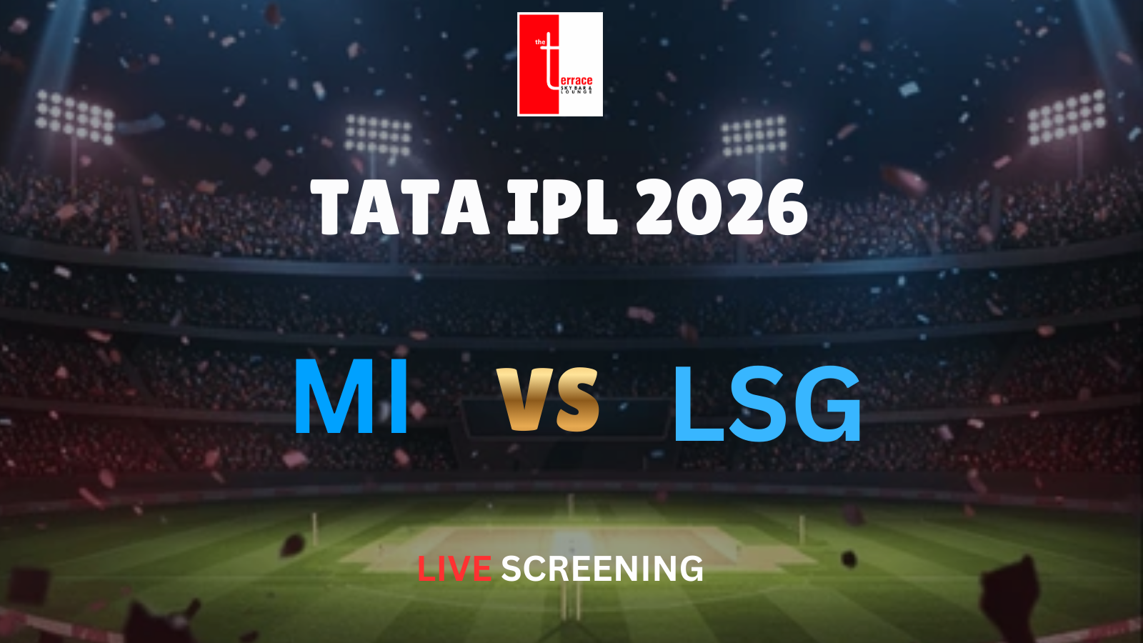 Get ready for an electrifying IPL clash as Mumbai Indians take on Lucknow Super Giants in a high-voltage showdown, live at The Terrace Skybar & Lounge!