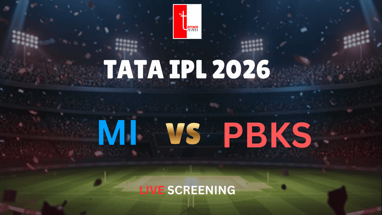 Get ready for a high-energy IPL clash as Mumbai Indians take on Punjab Kings in an action-packed encounter, live at The Terrace Skybar & Lounge!