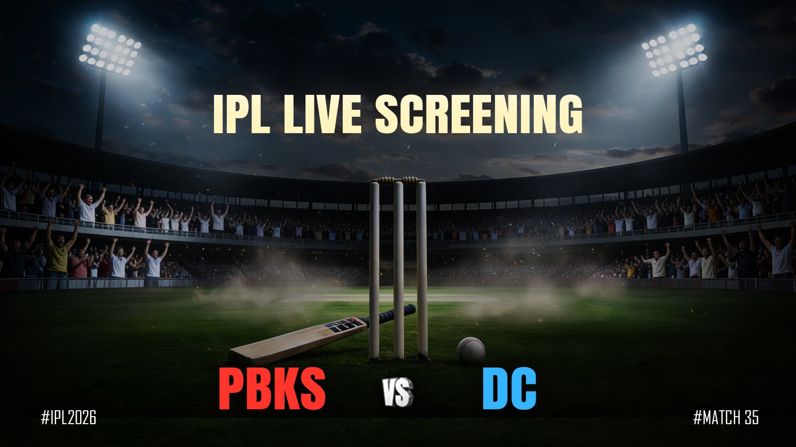 Catch the IPL action live as Punjab Kings take on Delhi Capitals this Saturday! Experience every boundary, wicket, and game-changing moment on massive screens with an electrifying crowd. The vibe is high-energy with great music, delicious food, and refreshing drinks all night long. Cheer for your favorite team and soak in the ultimate match-day atmosphere.
