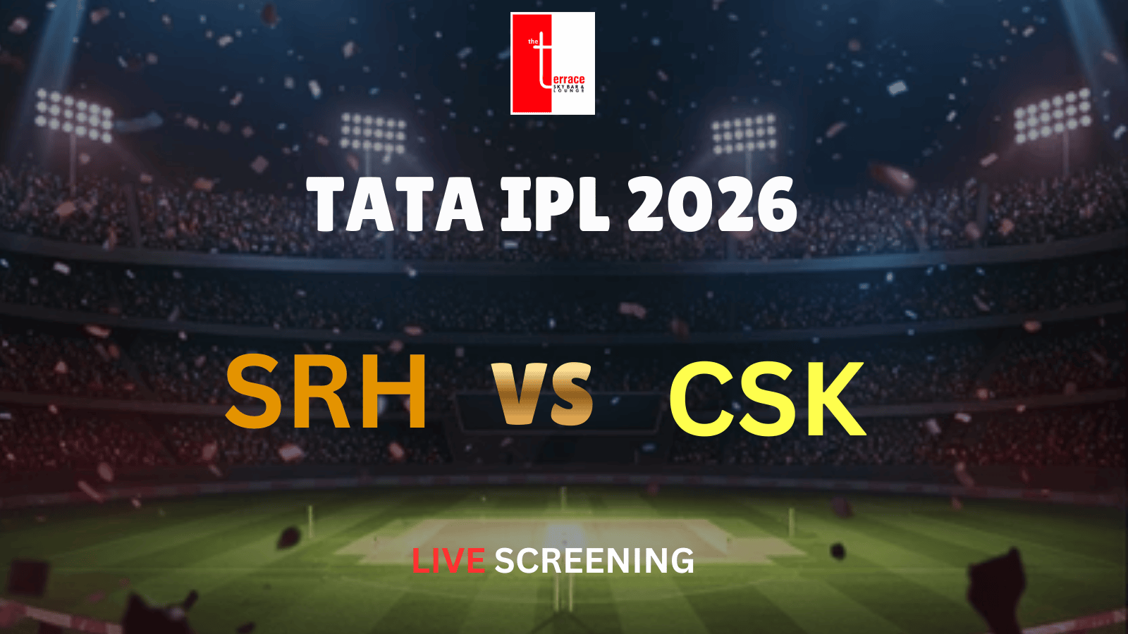 Get ready for an electrifying IPL clash as Sunrisers Hyderabad take on Chennai Super Kings in a high-voltage encounter, live at The Terrace Skybar & Lounge!