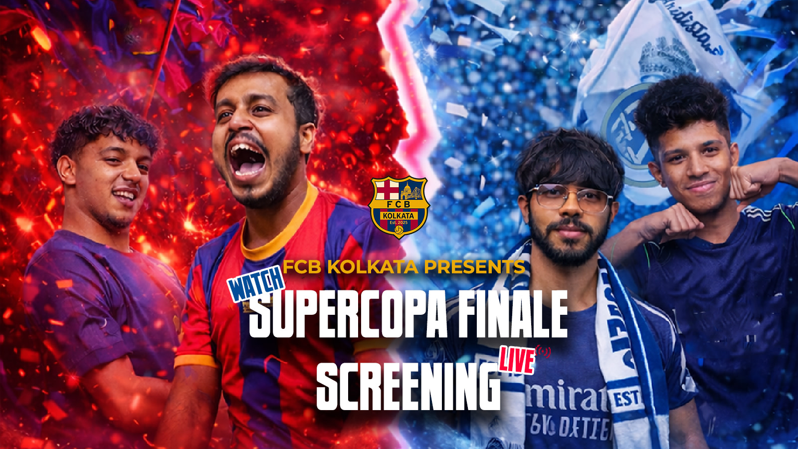 Biggest football rivalry in the world is back! Watch El Clasico Live at Kolkata's Biggest Sports Pub as FC Barcelona take on Real Madrid in the Supercopa final. A stadium like experience like never before. Presented by FCB Kolkata, one of India's largest barca supporters' club in collaboration with Five Mad Men. Get ready for some Mad scenes!